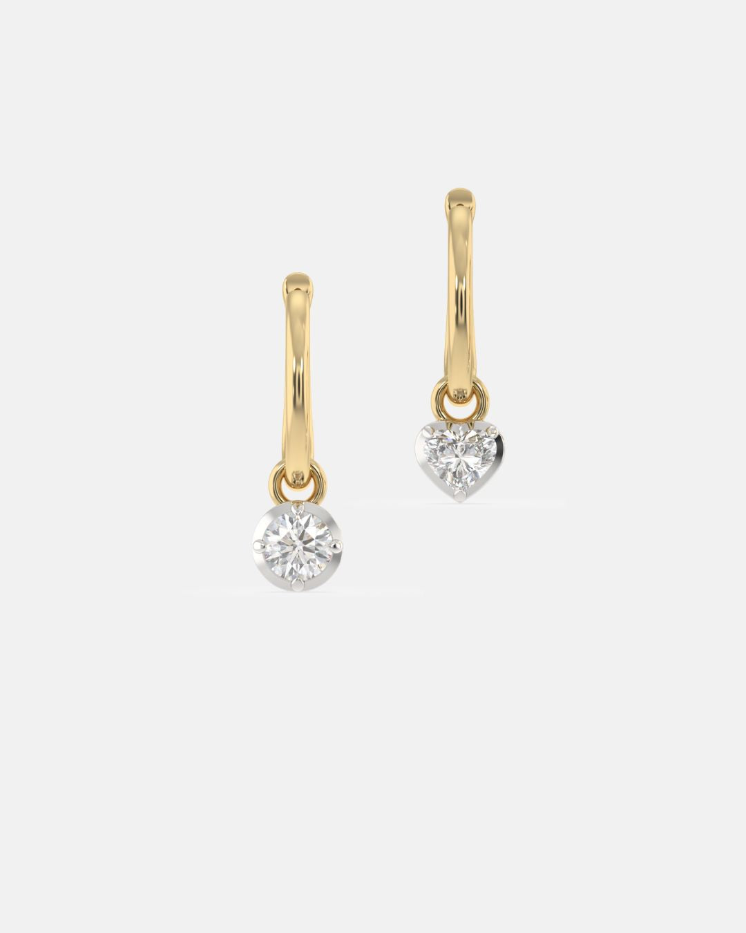 Each pair features one 0.50ct round brilliant-cut diamond and one 0.5ct Heart-shaped diamond, set in 18k white gold and yellow gold and Hoop Diameter 12mm.